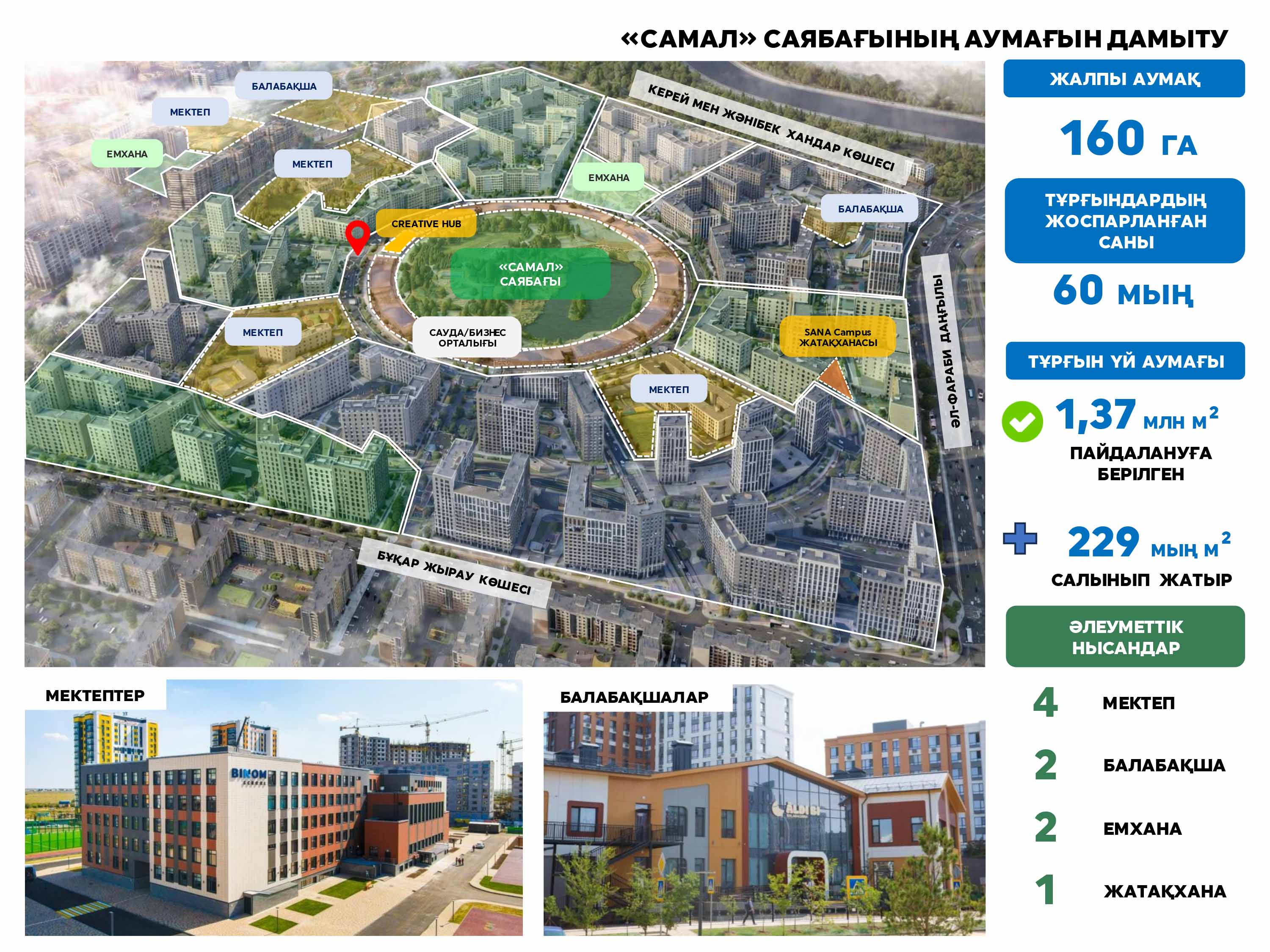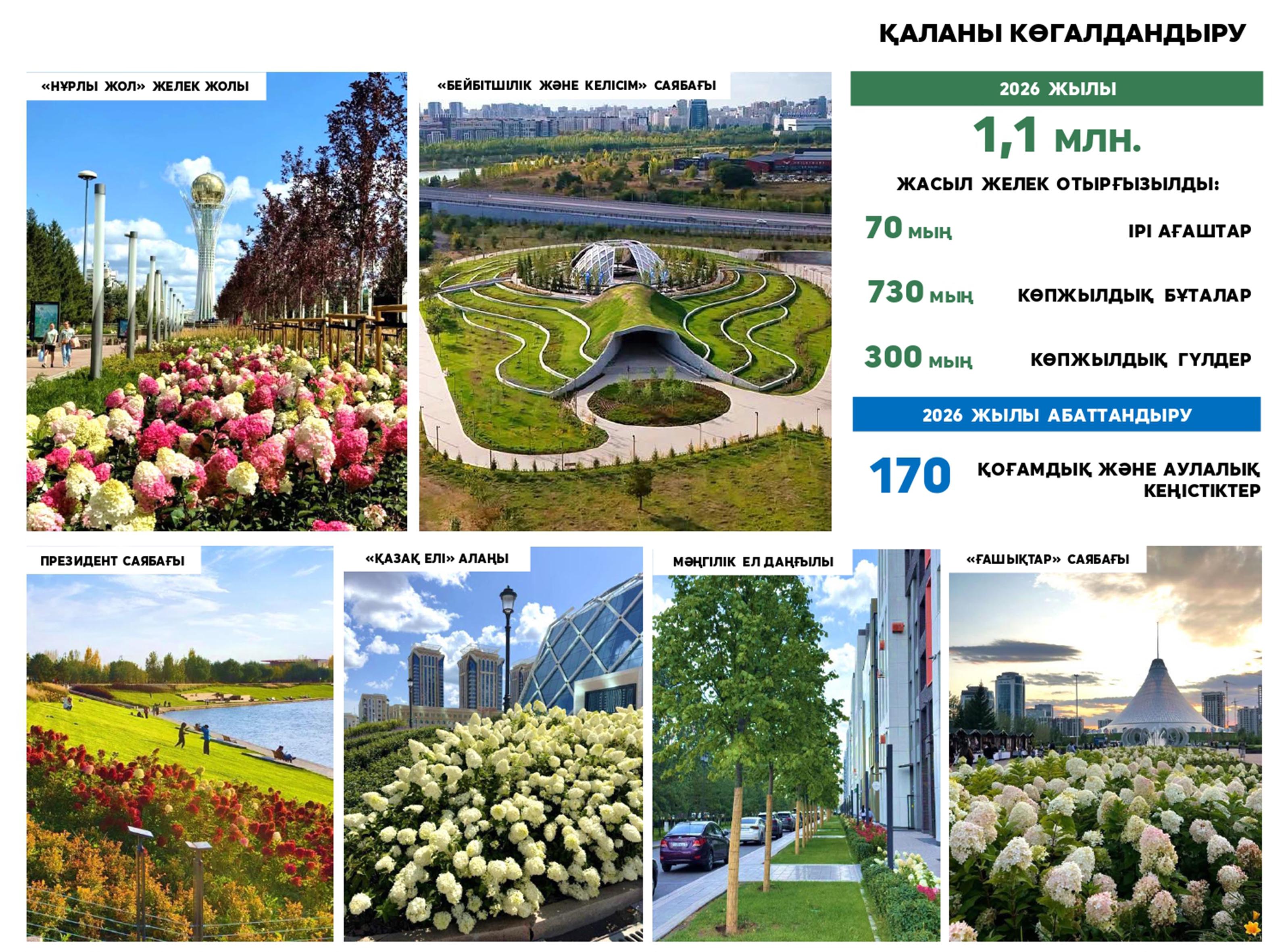 Астана әкімі Жеңіс Қасымбек Мемлекет басшысына шаһарды абаттандыру, қоғамдық кеңістіктерді көгалдандыру, сондай-ақ қолайлы және қауіпсіз қала қалыптастыру бағытында қолға алынған шаралар жөнінде мәлімет берді. Оның айтуынша, биыл елордада 173 орынды (қоғамдық кеңістіктер мен аулалар) жаңғырту, 1,1 миллион түп жасыл желек, атап айтқанда, көшеттер, бұталар, гүлдер мен ағаштар егу жоспарланып отыр. Негізгі жобалардың бірі – тұрғындар көп келетін «Самал» саябағы. Аталған аумақ отбасылық демалысқа, спортпен шұғылдануға және мәдени іс-шараларға ыңғайлы кеңістік ретінде жобалануда. Саябақта мұз айдыны, серуендеу бағдарлары, жаяу жүргінші көпірі, тоған, балаларға арналған ойын алаңы мен демалысқа ыңғайлы кеңістік қарастырылған.